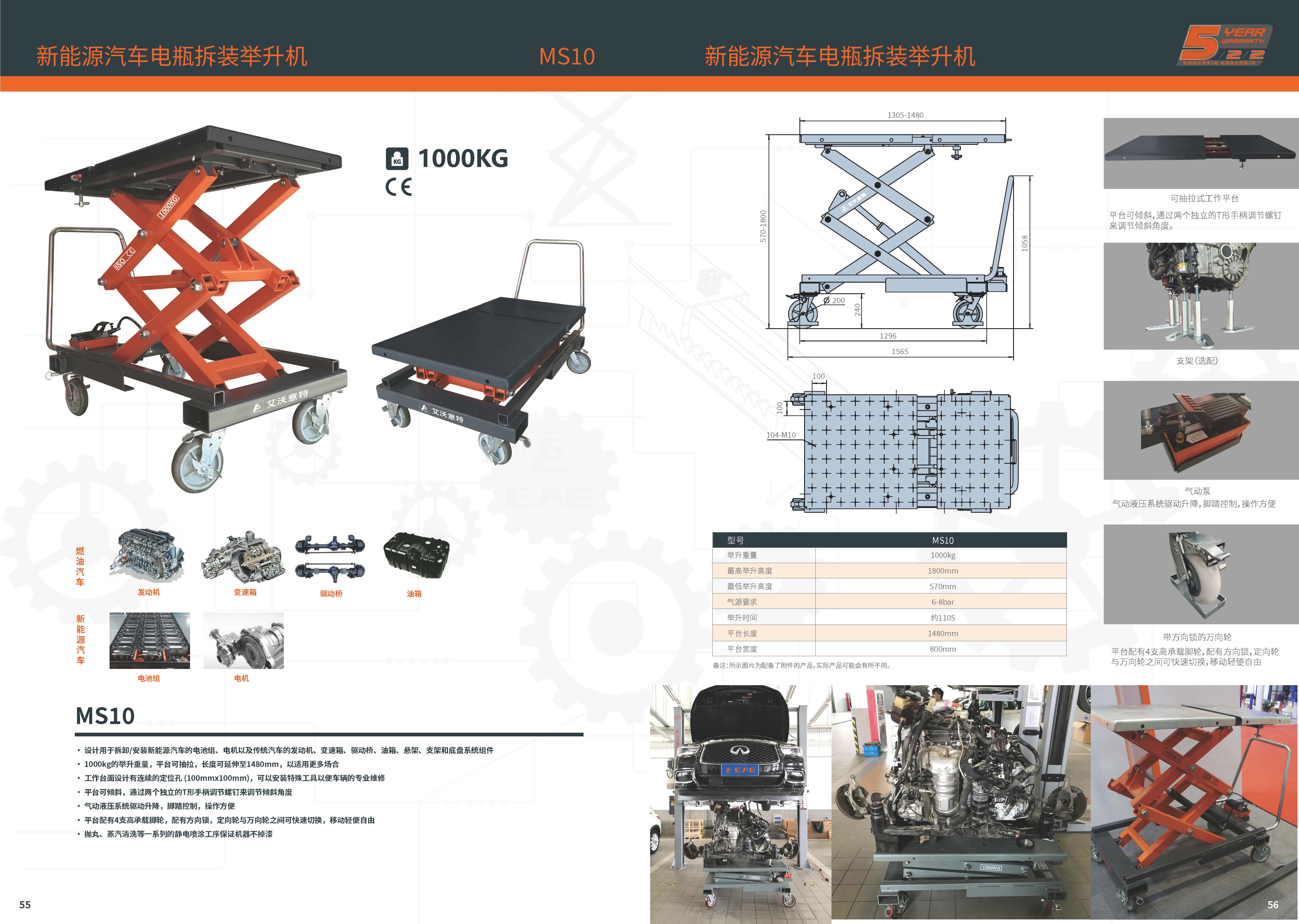 ·设计用于拆卸/安装新能源汽车的电池组、电机以及传统汽车的发动机、变速箱、驱动桥、油箱、悬架、支架和底盘系统组件;